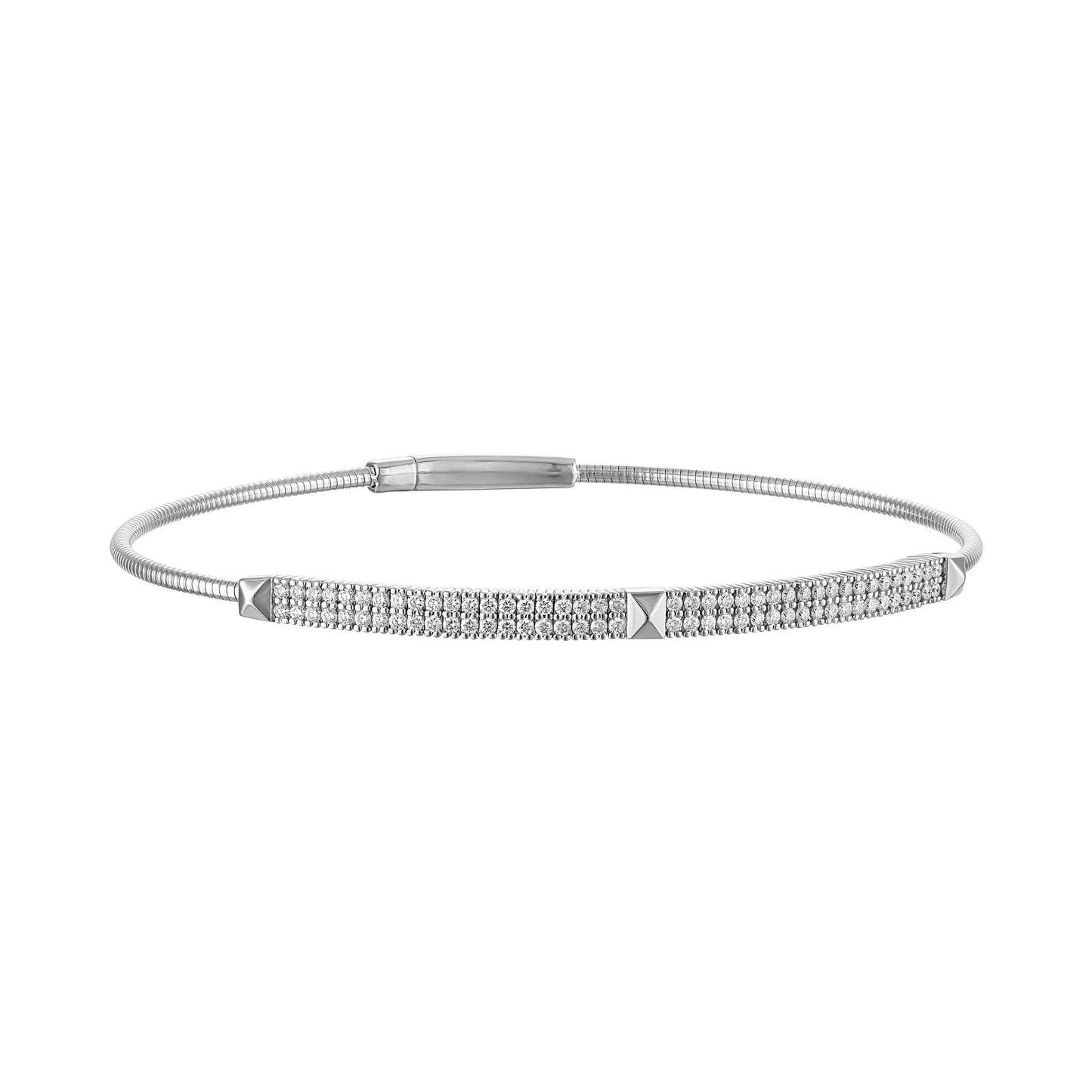 This flexible bangle features a sleek bar centerpiece adorned with rows of diamonds, framed by geometric pyramid studs for a hint of edge. Crafted in 14K gold with a flexible wire band, it offers both striking brilliance and effortless comfort. A perfect balance of structure and sparkle.