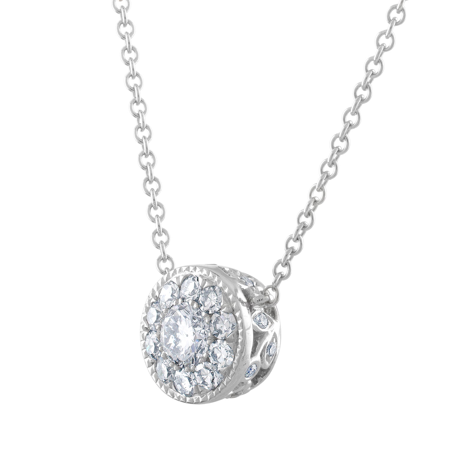 This elegant pendant necklace features a brilliant round center diamond surrounded by a cluster halo, offering exceptional sparkle from every angle. The gallery is beautifully detailed with additional diamond accents, adding depth and dimension to the design. Suspended from a classic cable chain, this piece is perfect for everyday wear or layering with other favorites.