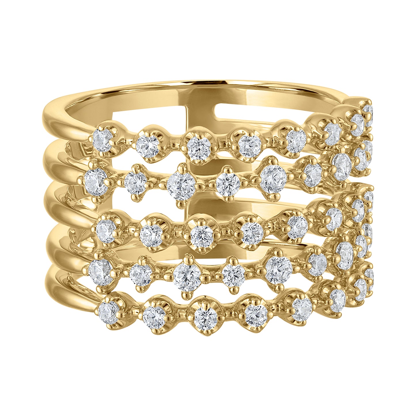 This bold 14K gold multi-row ring is designed to look like a stylish stack of bands, yet it’s all one seamless piece. Featuring perfectly matched round diamonds set in a delicate lace-like pattern, it delivers the layered look you love with the ease of a single ring. Elegant, structured, and effortlessly eye-catching.