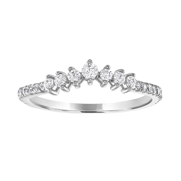 This elegant tiara-style band features a row of graduated round diamonds in a shared-prong setting, creating a crown-like silhouette that perfectly complements engagement rings. Its refined sparkle and graceful curve make it an ideal choice for stacking or wearing as a statement piece.