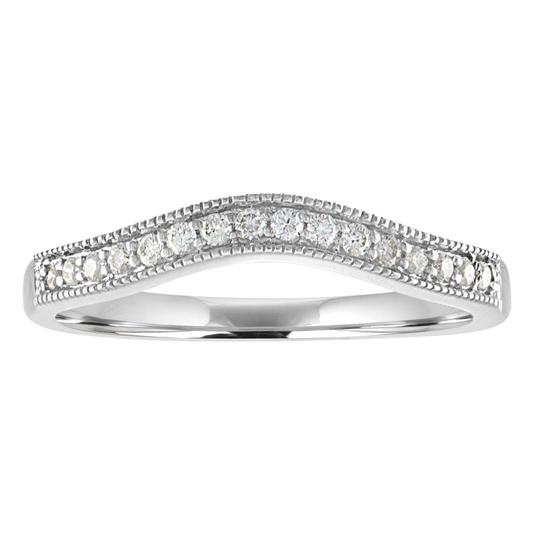 This timeless curved band features a row of round diamonds framed with delicate milgrain detailing along the edges. The graceful contour fits perfectly with engagement rings, adding vintage charm and sparkle to any bridal set.