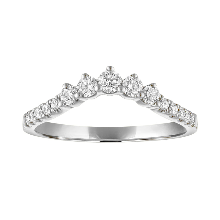 Inspired by the elegance of a crown, this tiara diamond band showcases round diamonds in a refined shared-prong setting. Designed to highlight any engagement ring, it adds a regal sparkle and timeless sophistication to your bridal stack.