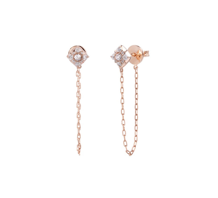 These dainty stud earrings feature a sparkling cluster of diamonds connected by a delicate chain that loops behind the ear. Crafted in solid 14K gold, they add a subtle edge and a hint of movement, perfect for layering or wearing solo with a twist.