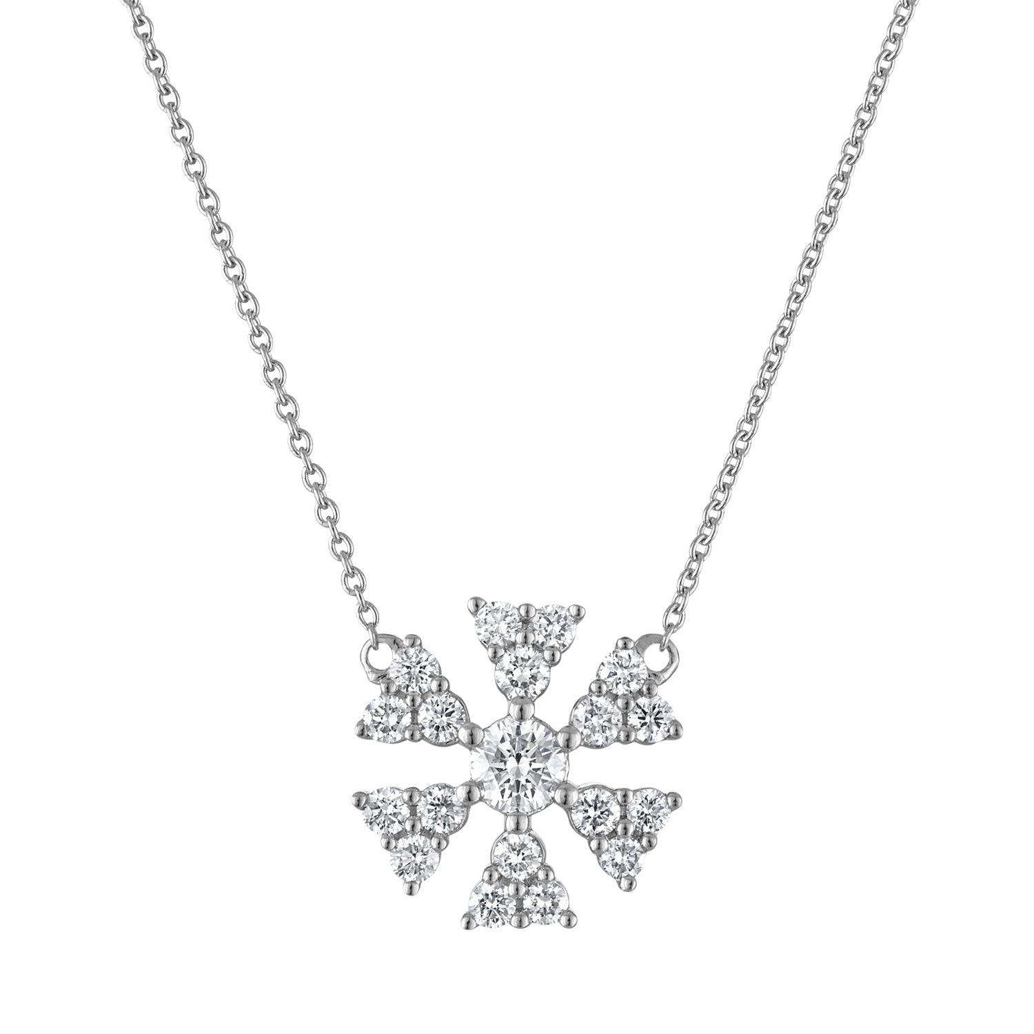 A radiant flower-like design crafted with precision set round diamonds forming symmetrical triangular clusters. Each petal is composed of three perfectly matched stones, creating a harmonious and dimensional bloom centered around a brilliant diamond. A refined expression of elegance and balance, ideal for everyday beauty or meaningful gifting.
