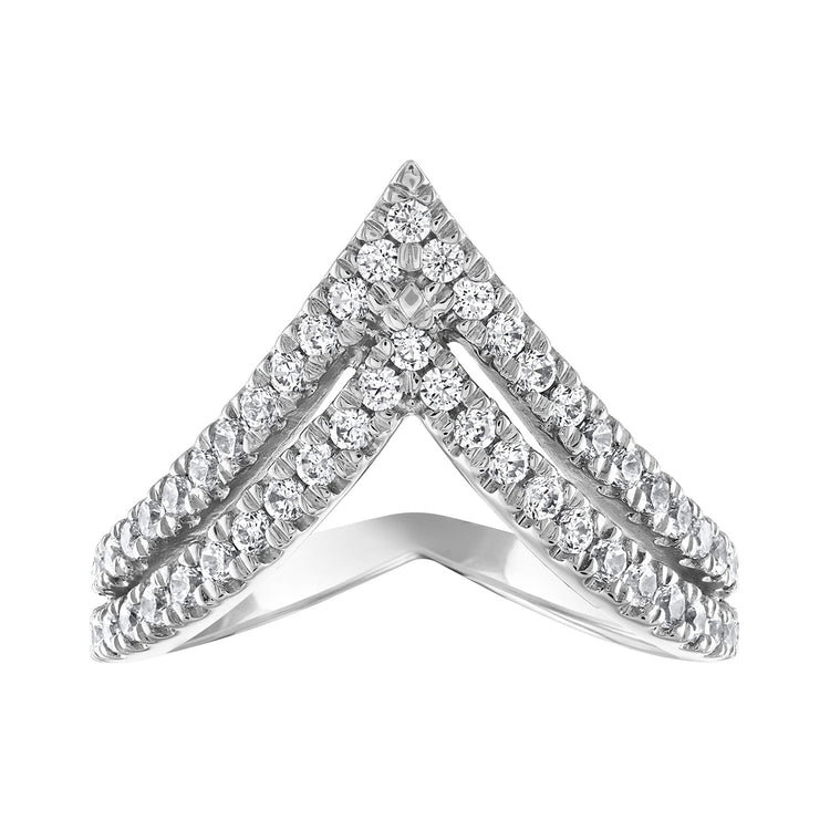 Crafted in 14K white gold, this striking double chevron band showcases two rows of round pavé-set diamonds that meet in a bold V-shaped design. Its dimensional silhouette offers brilliant sparkle from every angle, making it a perfect enhancer for engagement rings or a statement piece for stacking.
