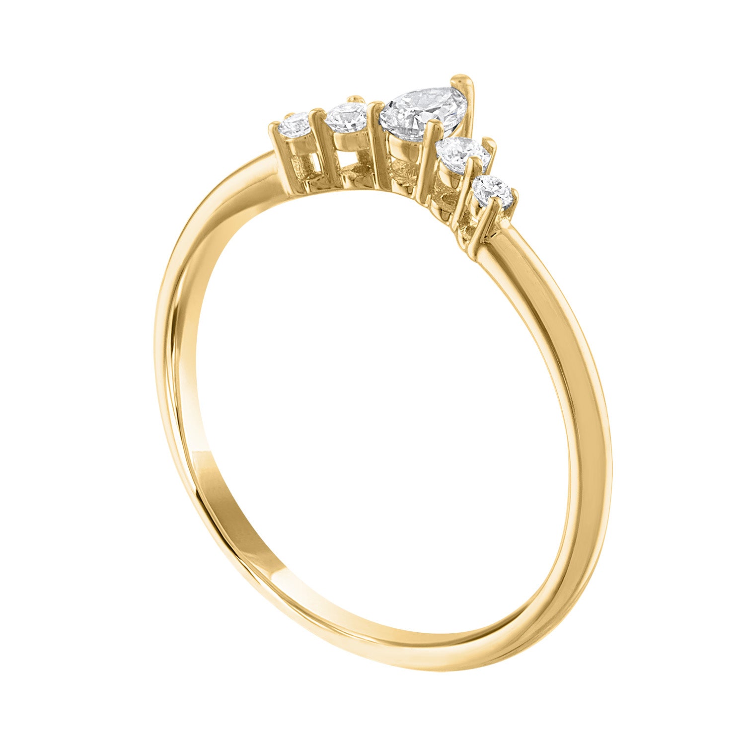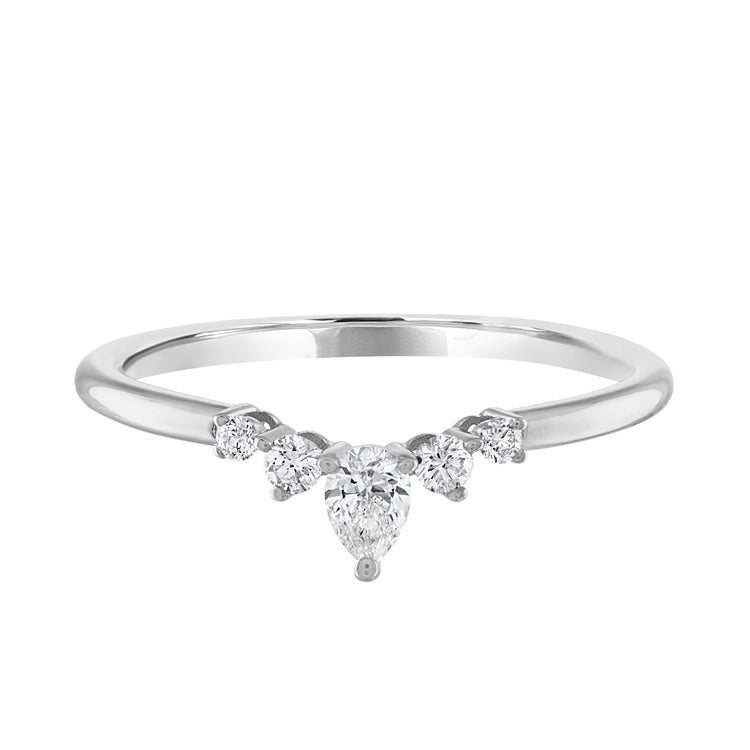 Crafted in 14K white gold, this tiara-style band features a center pear-shaped diamond accented by graduated round prong-set diamonds along a soft V contour. Elegant and refined, it’s designed to nest perfectly with engagement rings or add a delicate touch of sparkle to any stack.