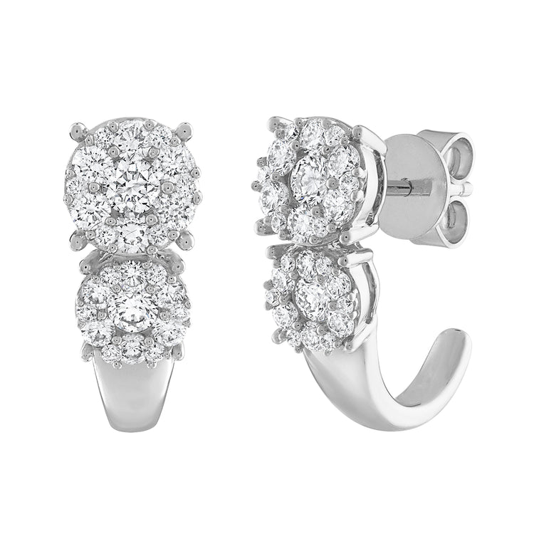 These chic 14K gold earrings feature two brilliant diamond clusters that sit gracefully above a sleek gold hoop-style curve. Designed to hug the ear with sparkle and sophistication, they offer the perfect blend of classic charm and modern edge, ideal for everyday glam or a special night out.