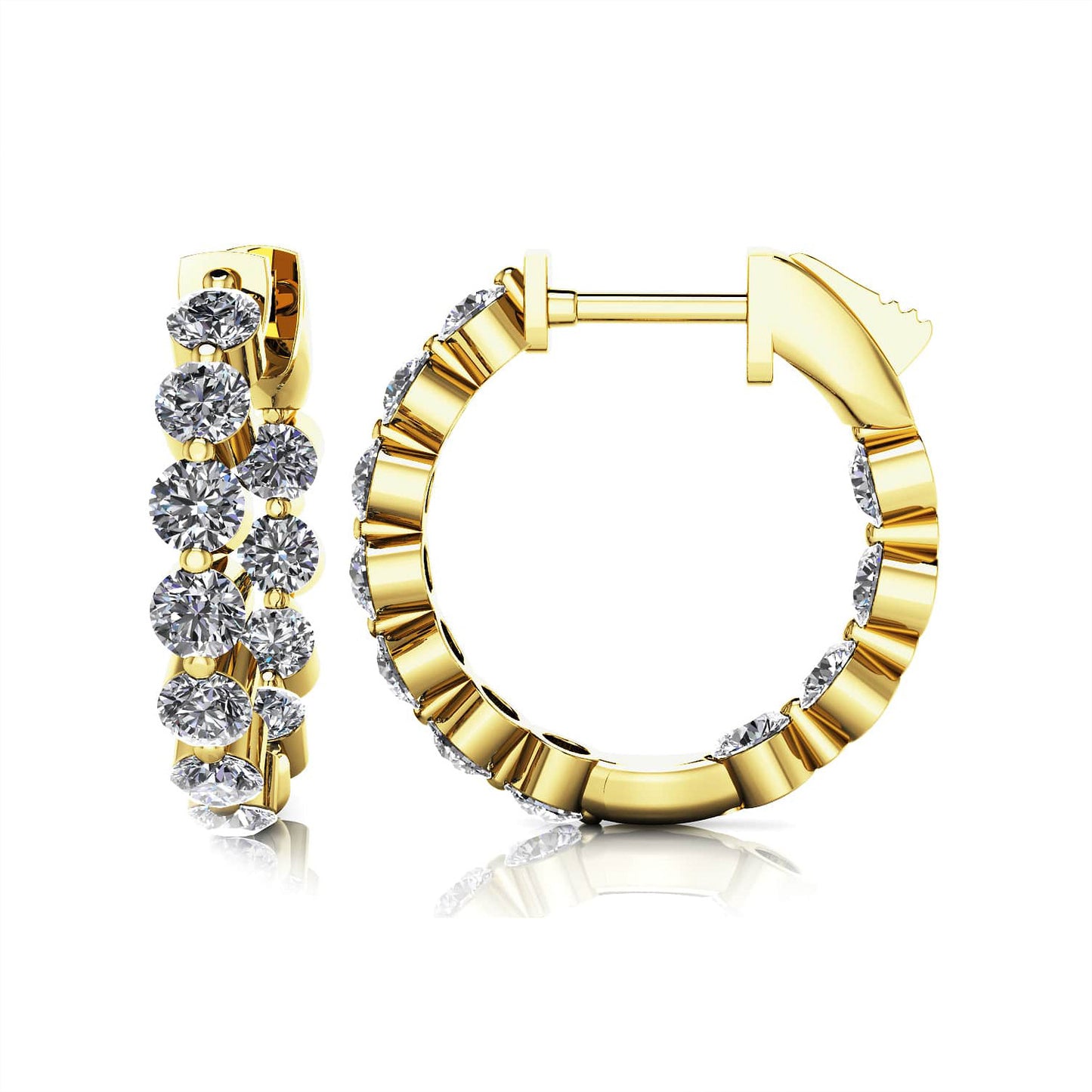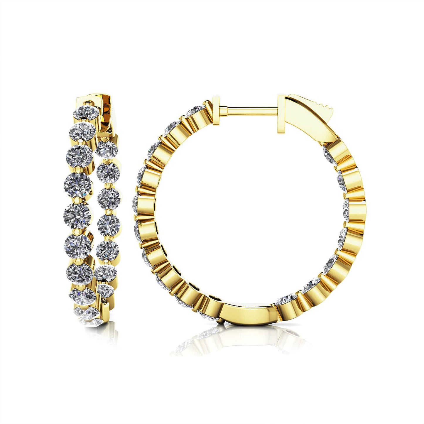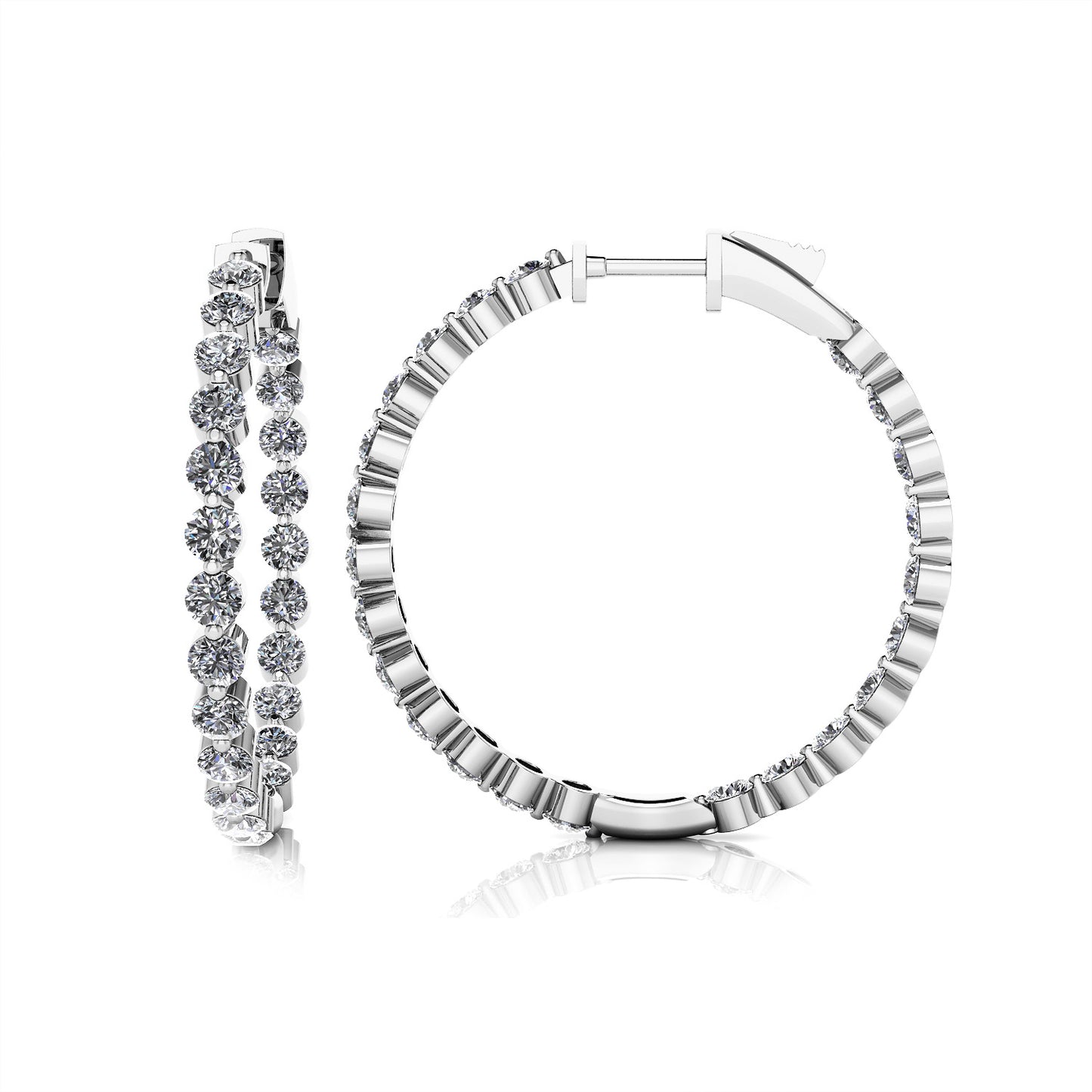 These elegant 14K gold hoop earrings feature a stunning in-and-out design, with diamonds set on both the inner and outer sides for maximum sparkle from every angle. Crafted with single prong setting, they allow light to flood each stone, creating a brilliant, airy effect. Their bold size makes a confident statement, while the open setting keeps them effortlessly elegant.
