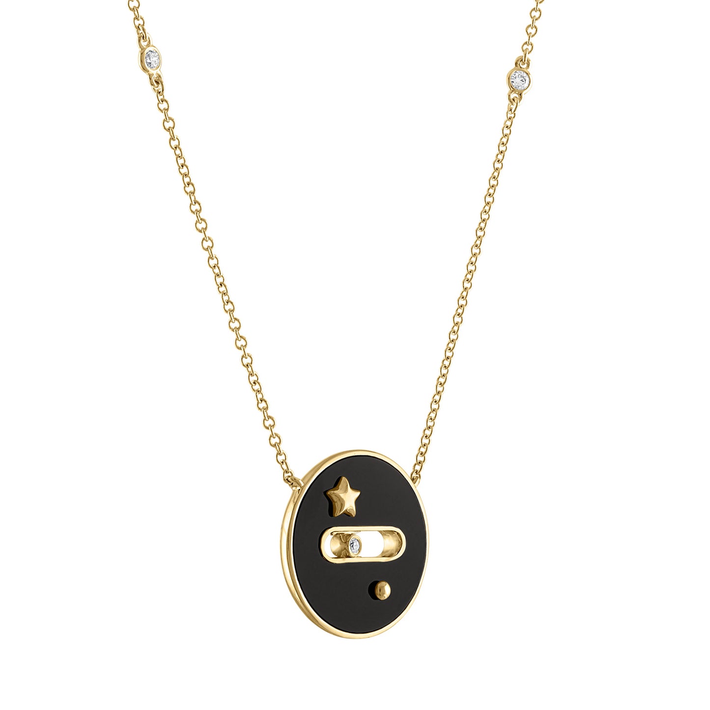 This pendant features a round onyx disc set in 14K gold, adorned with a bezel-set diamond that moves freely within a horizontal channel, creating a captivating shimmer with every motion. A small gold star and bead add charm to the sleek black background, while diamond stations along the chain elevate the look with extra brilliance.