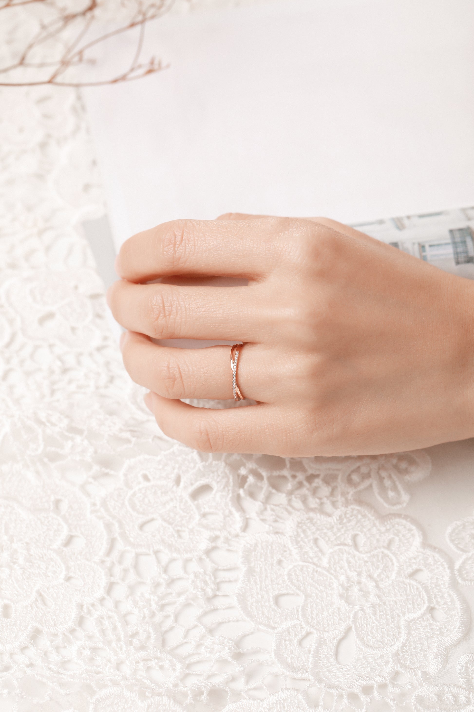 Crafted in 14K gold and set with natural diamonds, this band features a graceful bypass design accented with a row of pave-set diamonds. The fluid silhouette gives it a modern yet timeless appeal, making it an elegant choice for stacking, pairing with an engagement ring, or wearing as an anniversary band.