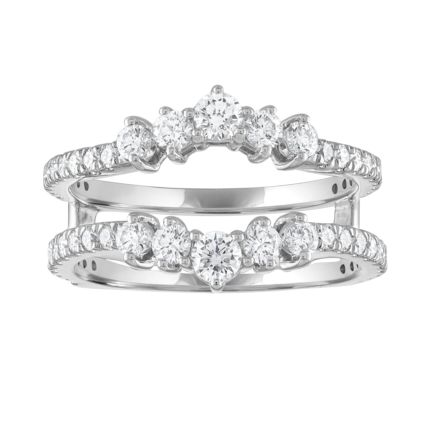 Crafted in 14K white gold, this tiara-style guard band features two rows of alternating round prong-set diamonds designed to frame and enhance an engagement ring. Its open-center construction ensures a perfect fit while adding extra brilliance and dimension, creating a complete and elegant bridal look.